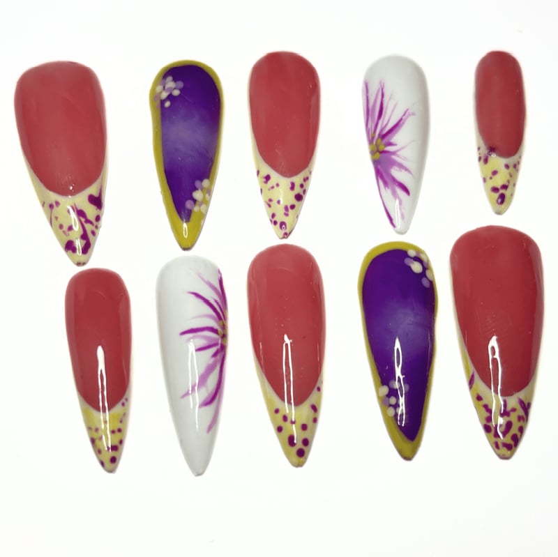 This orchid-inspired set features vibrant coral, purple, and white tones with delicate floral accents and playful dotted details, creating a fresh, tropical feel.