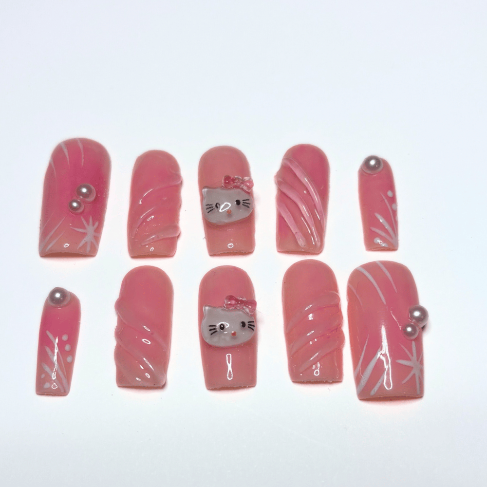 The Soft Girl nail set is the ultimate mix of sweetness and style! Featuring a dreamy pink base, this set is all about soft, feminine vibes with delicate white swirl designs, subtle star accents, and dainty pearls for an extra touch of elegance. The star of the show? An adorable kitty face with a cute little bow, adding the perfect playful yet chic touch. Soft Girl is for those who love a little charm, a little glam, and a whole lot of pretty!